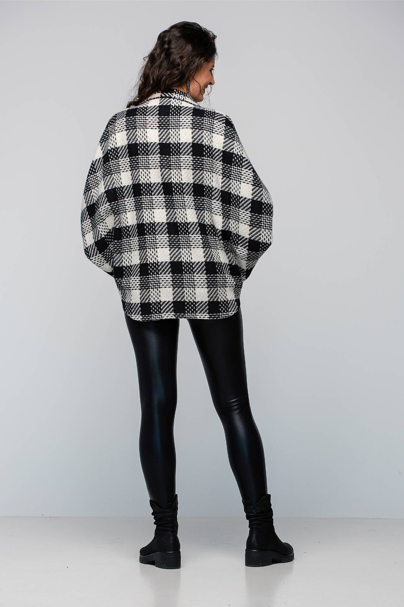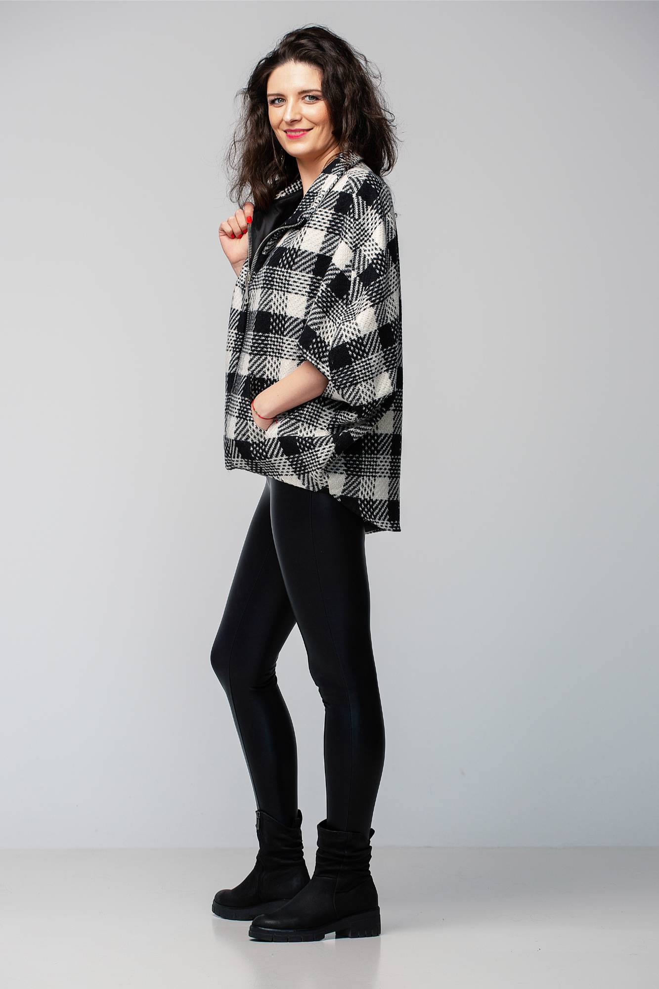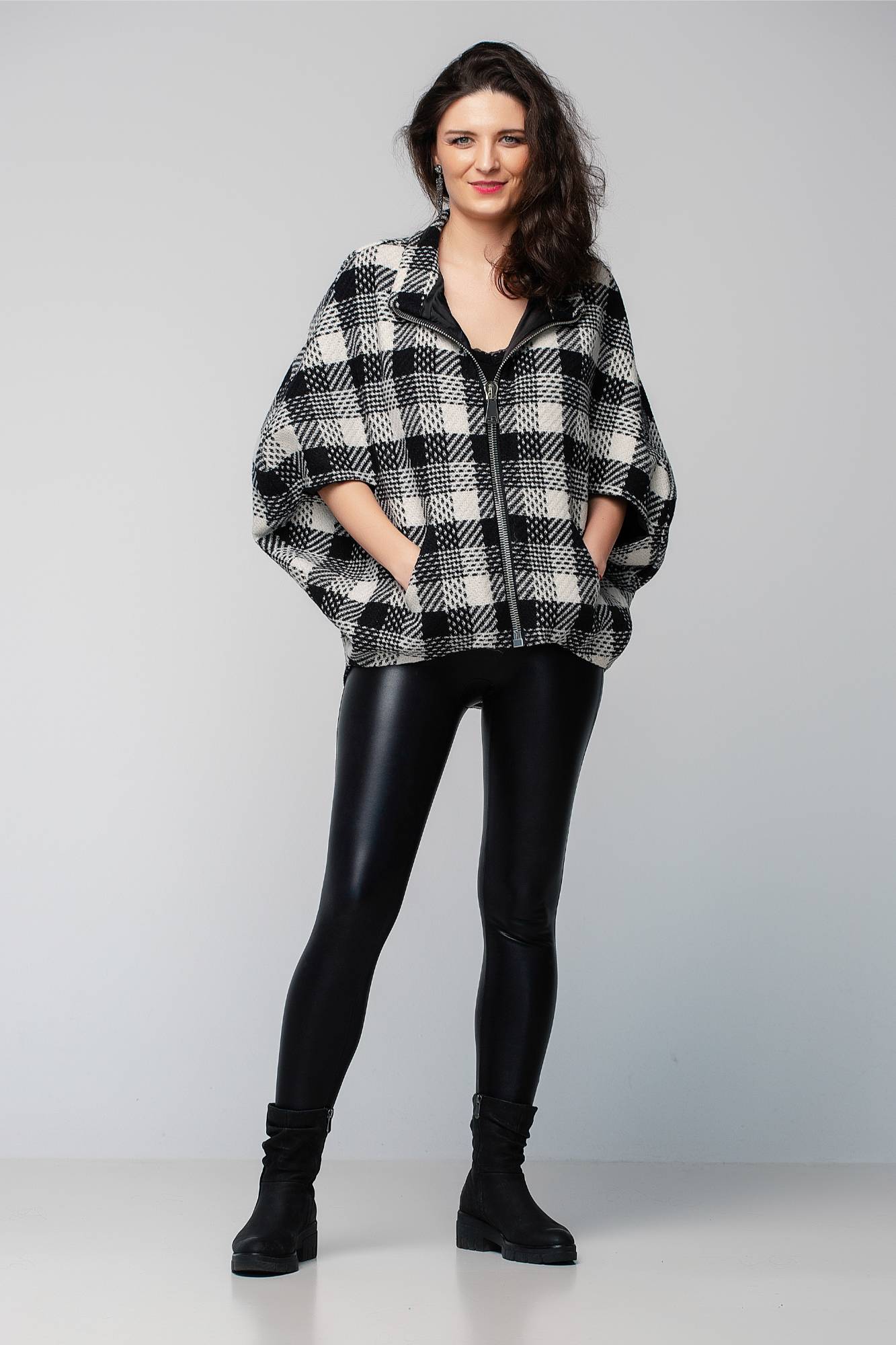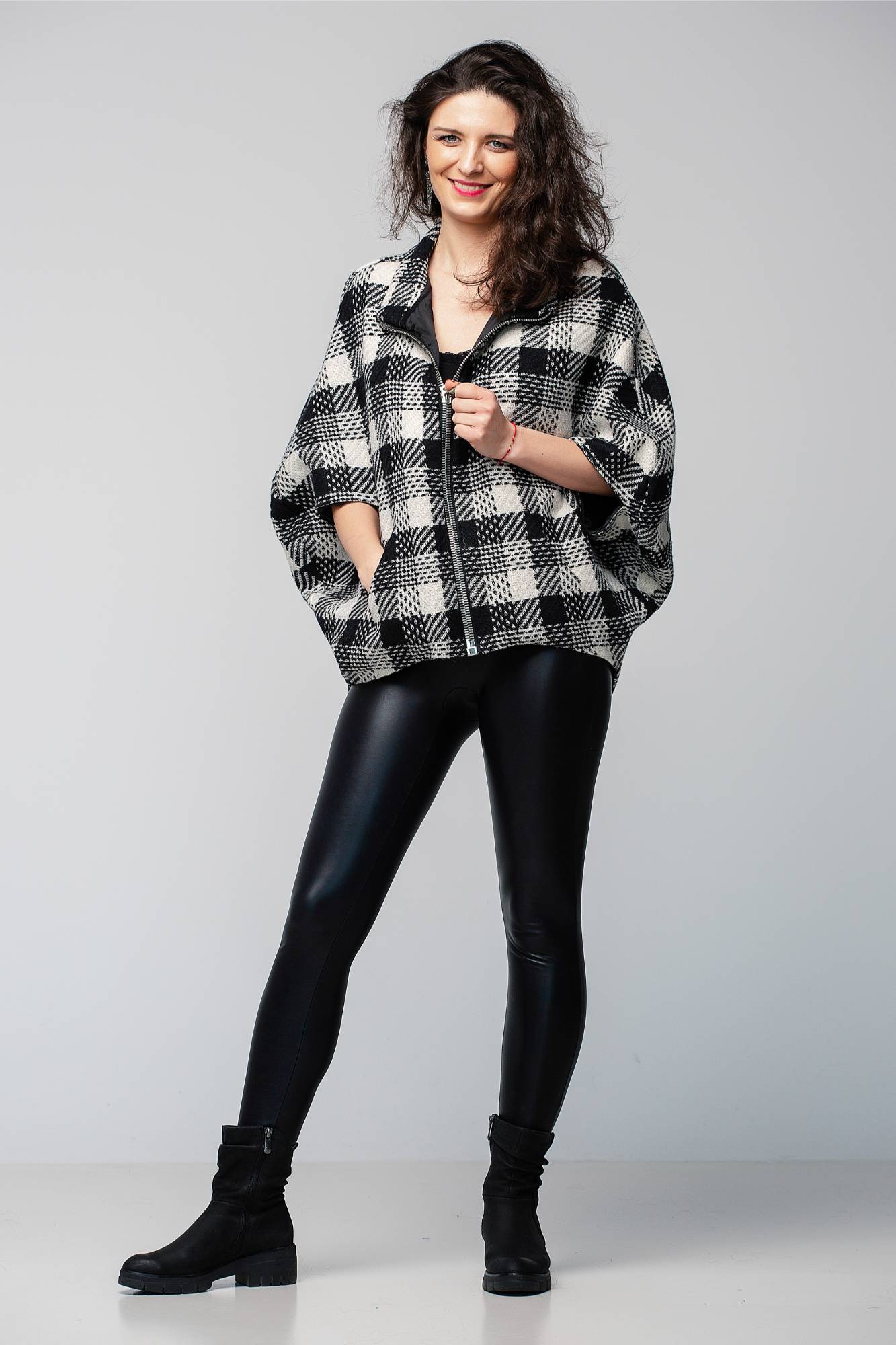 Geacă din lână cu fermoar, alb-negru